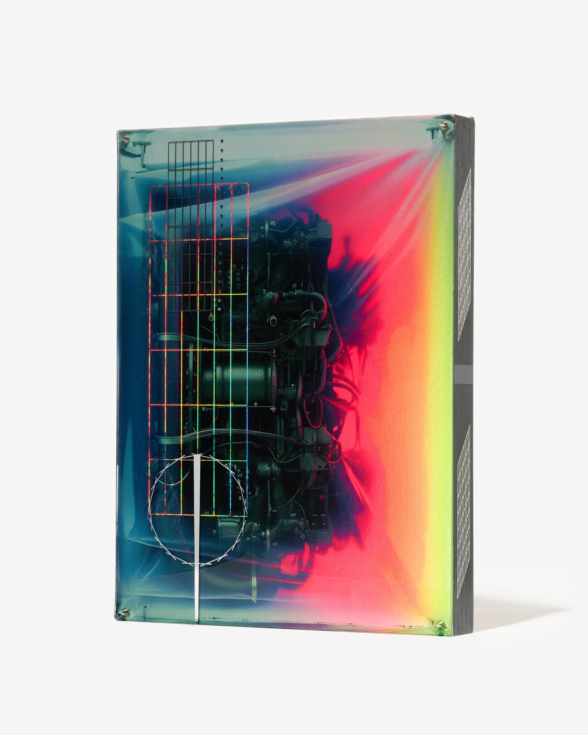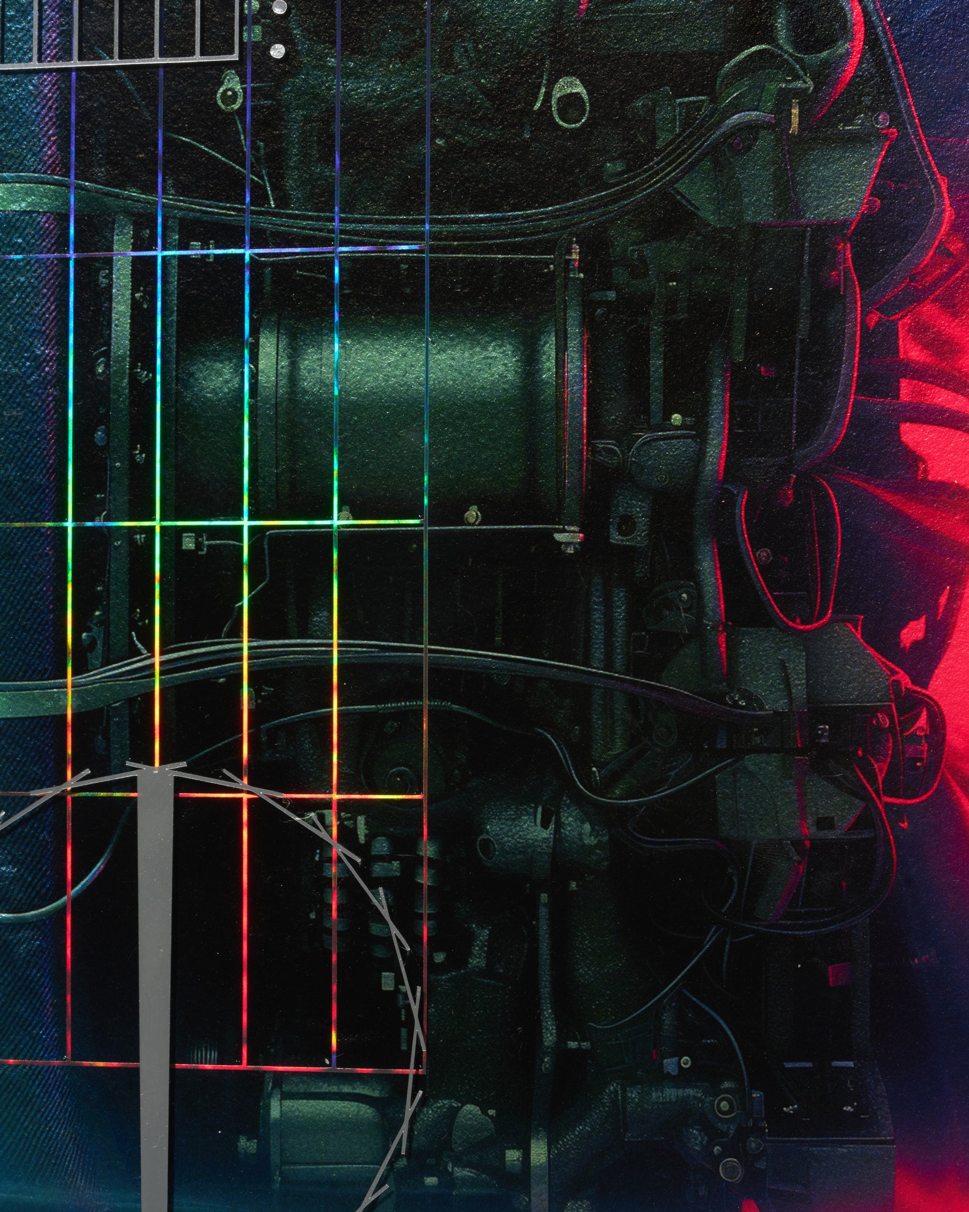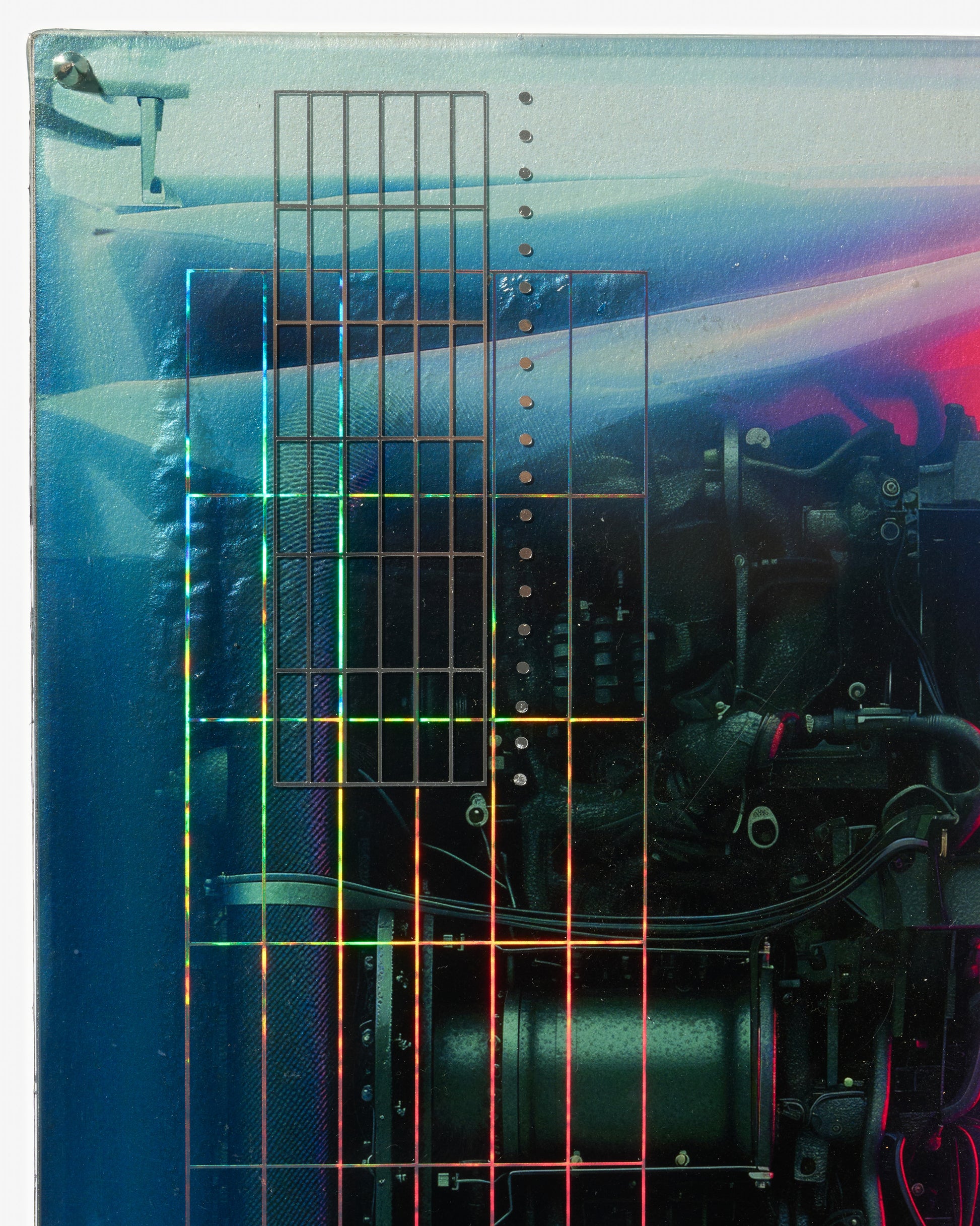 The first completed physical study to emerge from Chuck's IMAGINED WRECKAGE project, 'Surface Threat' is a mixed media artwork that combines AI imagery with mediums such as epoxy resin, machine-cut vinyl, and metal hardware.