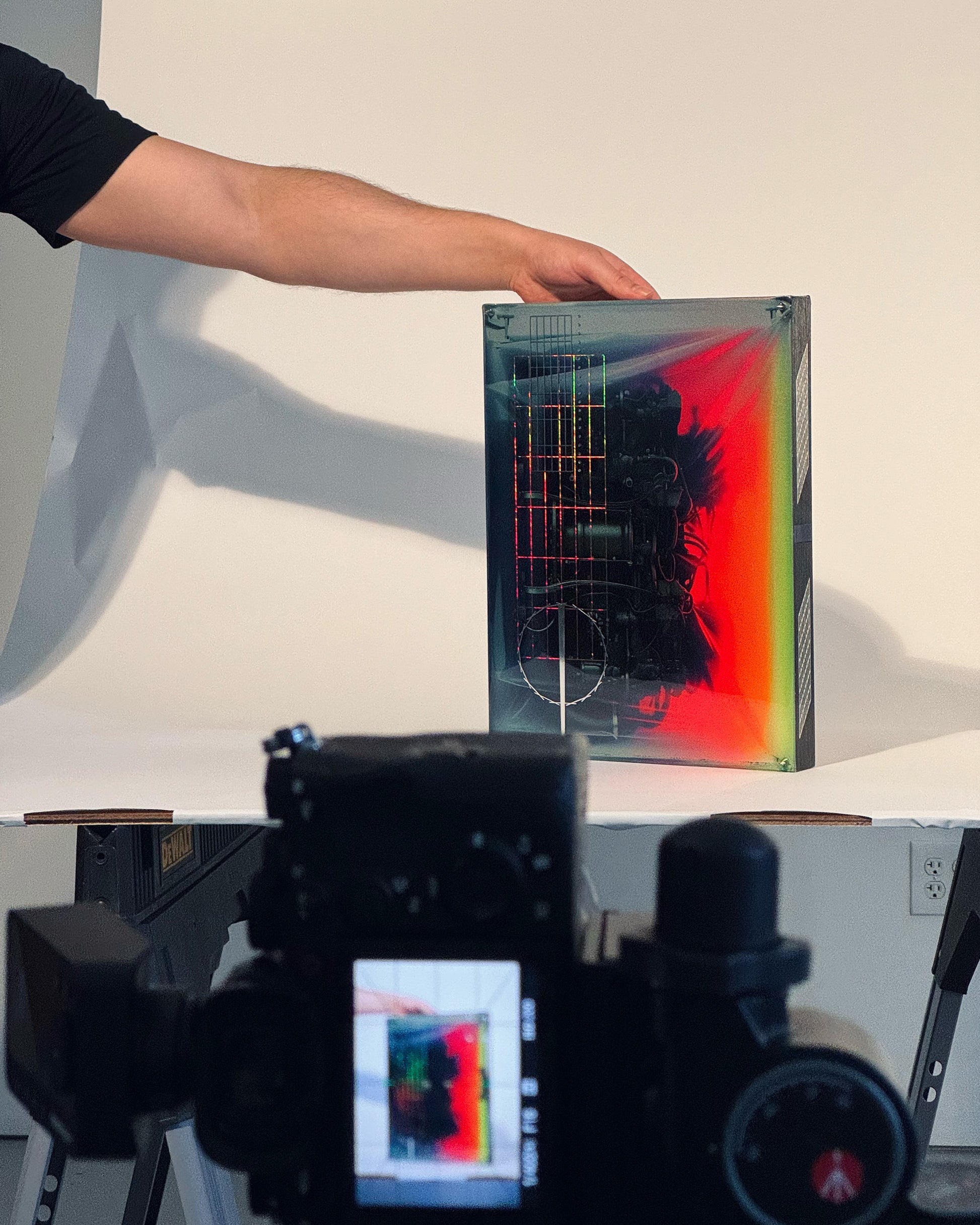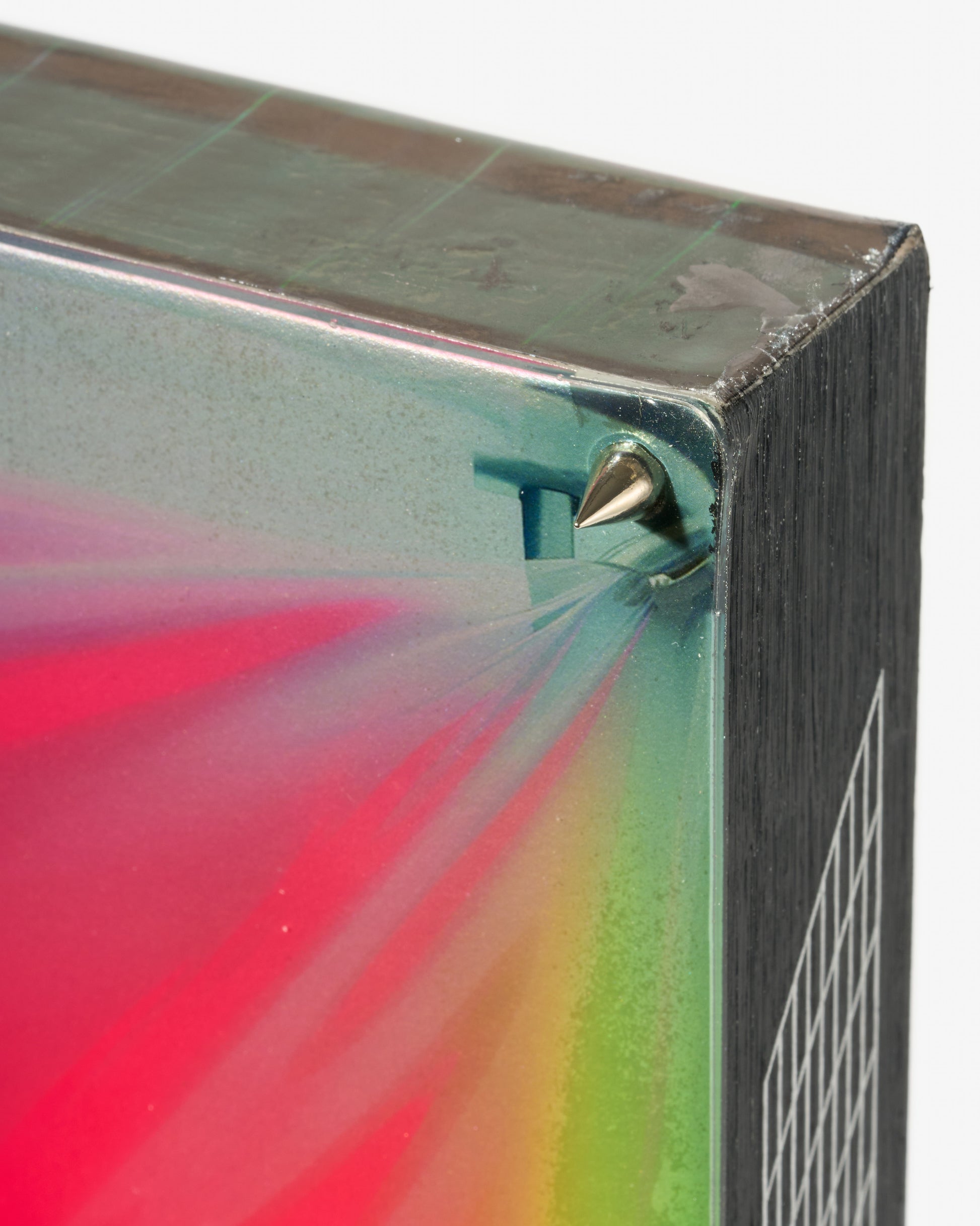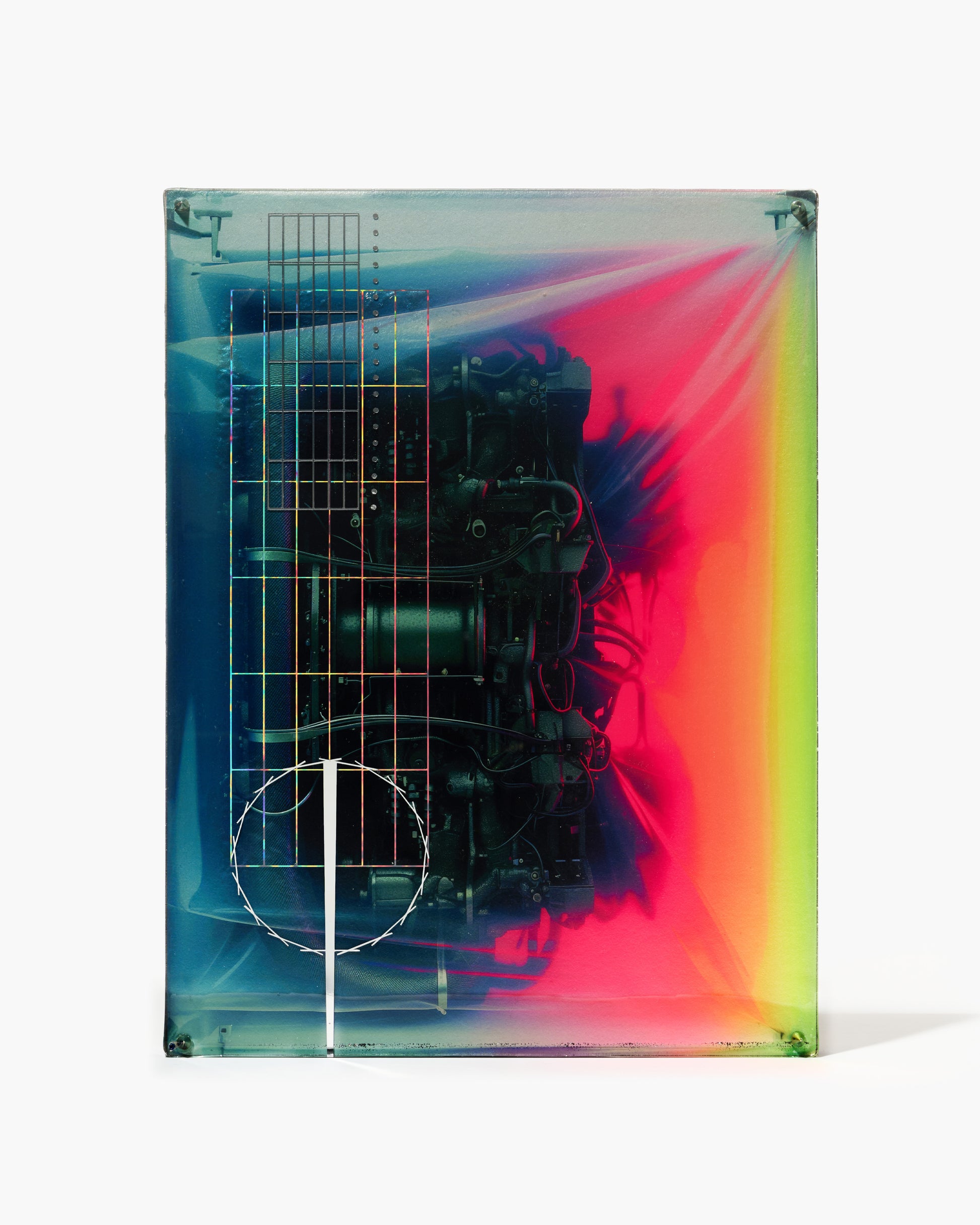 The first completed physical study to emerge from Chuck's IMAGINED WRECKAGE project, 'Surface Threat' is a mixed media artwork that combines AI imagery with mediums such as epoxy resin, machine-cut vinyl, and metal hardware.