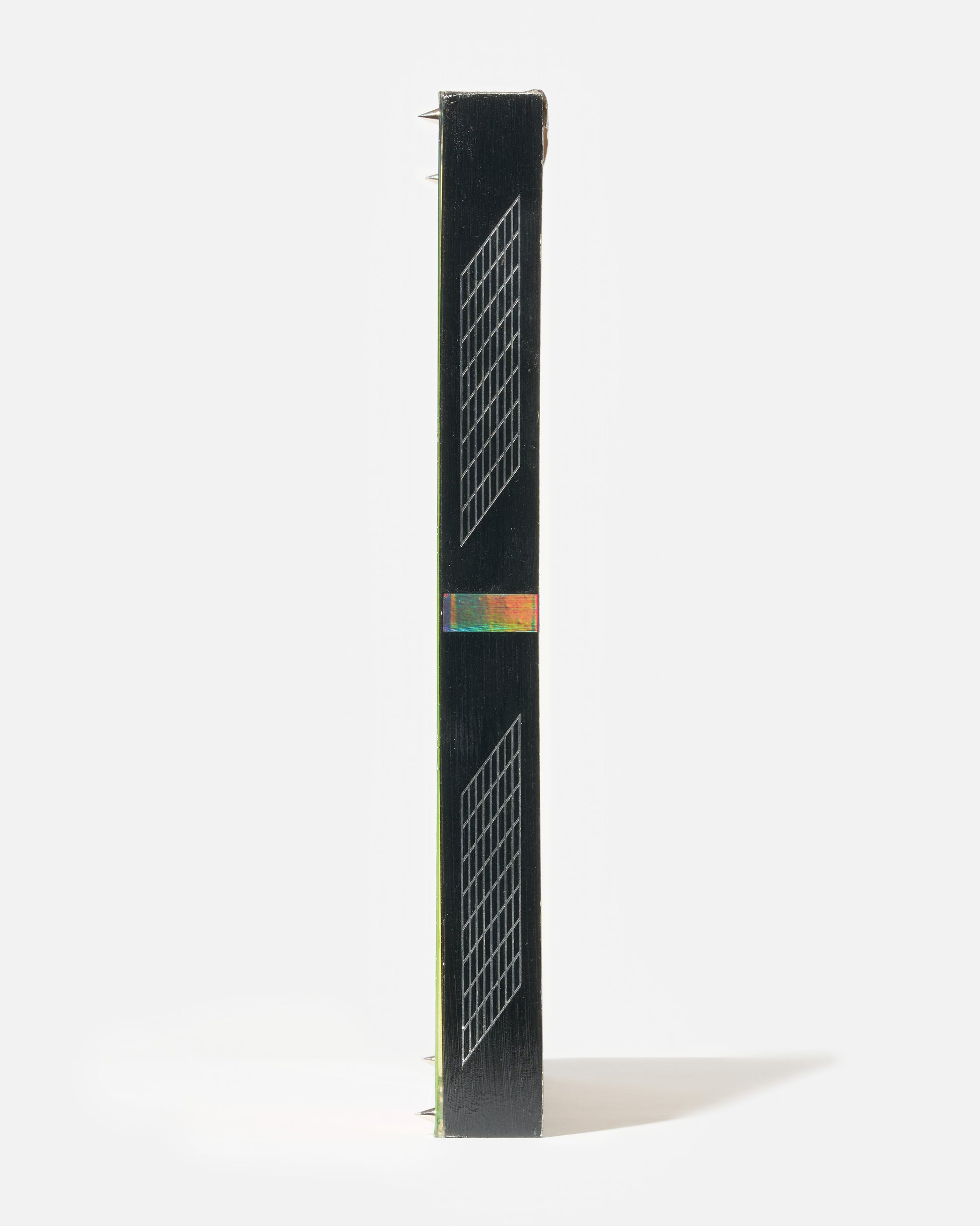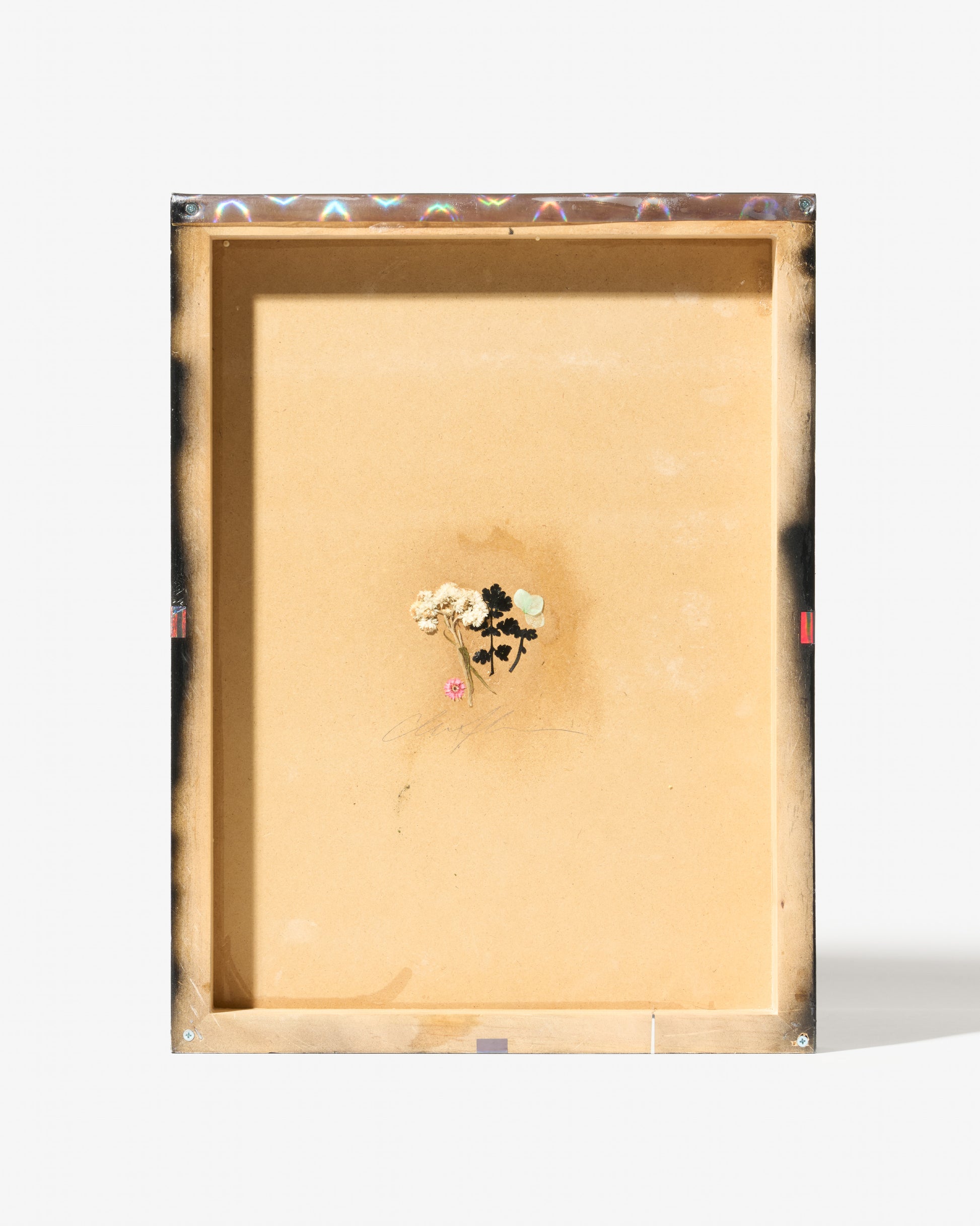 Inkjet print, adhesive, metal spikes, holographic vinyl, acrylic, dried flowers & epoxy resin on wood panel